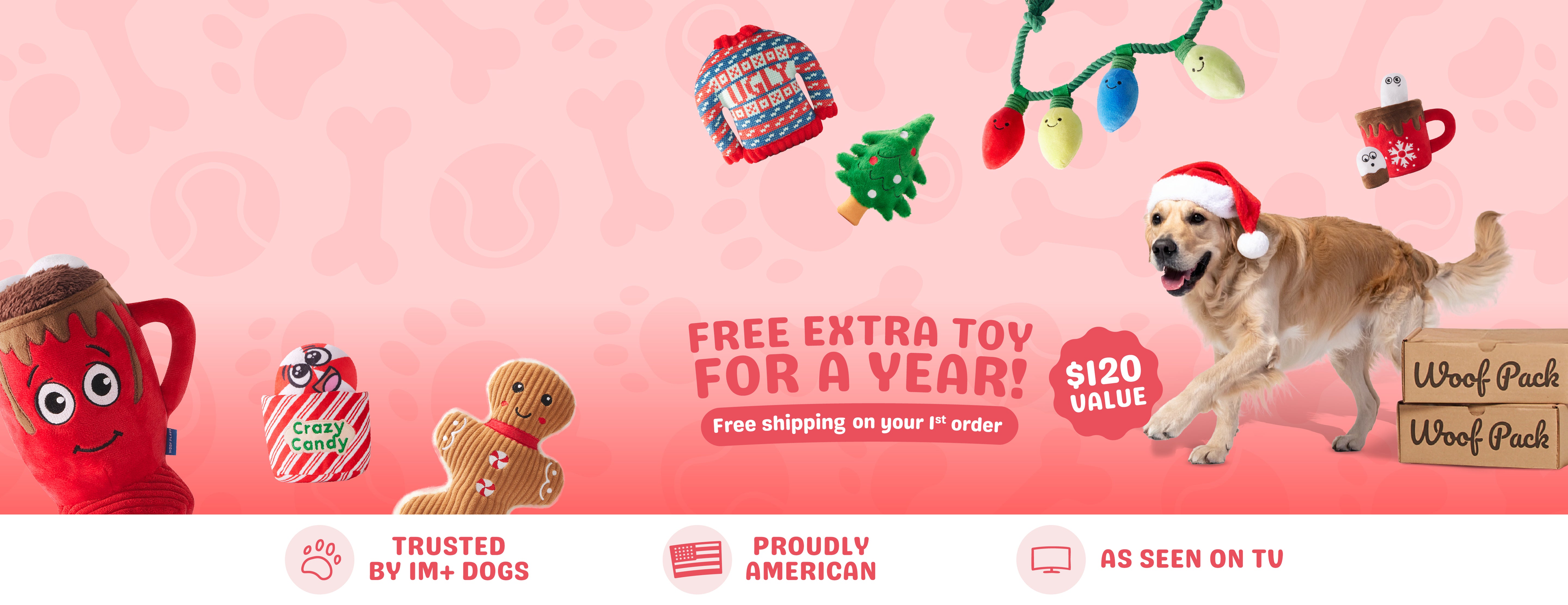 Choose a monthly Woof Pack subscription starting at only $23/month, and get toys and treats delivered to your door.