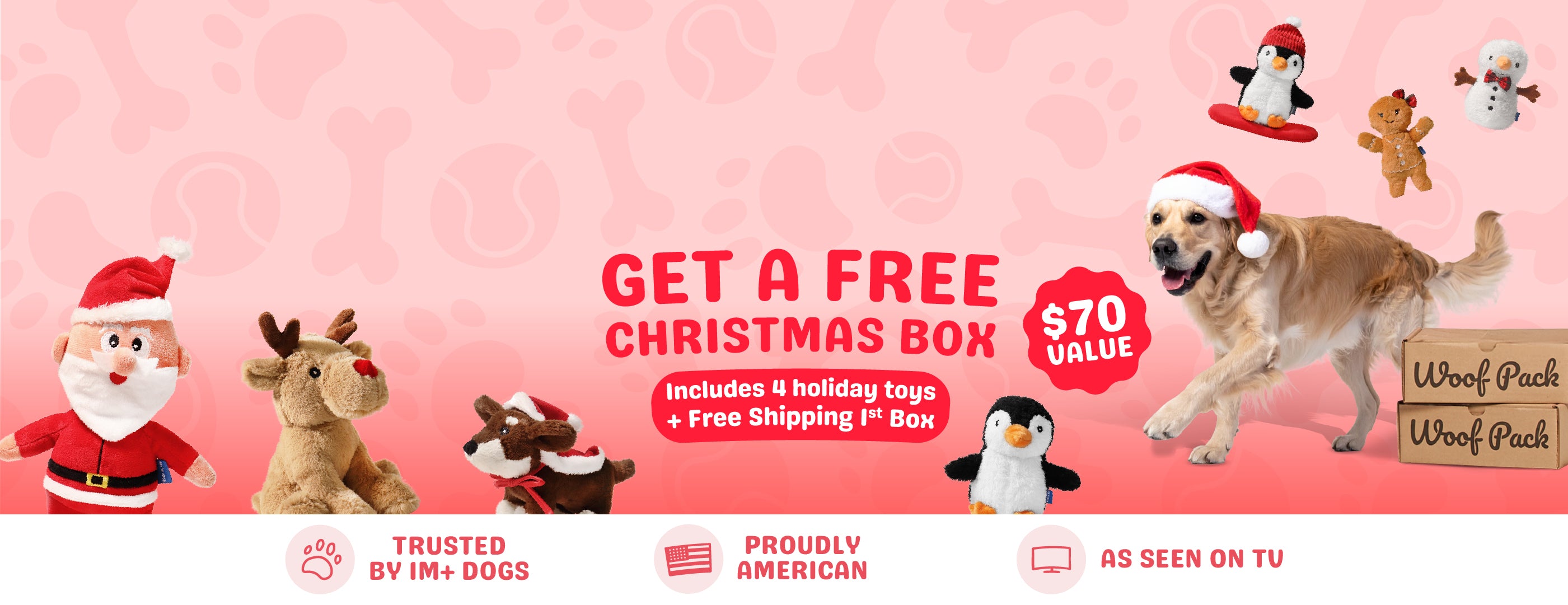 Each Woof Pack is customized to your dog’s size and needs, built around a new monthly theme, and filled with unique toys and Canadian/American-made natural treats. Every delivery is designed to surprise and delight, backed by our Happiness Guarantee - because joy should always be in the box.