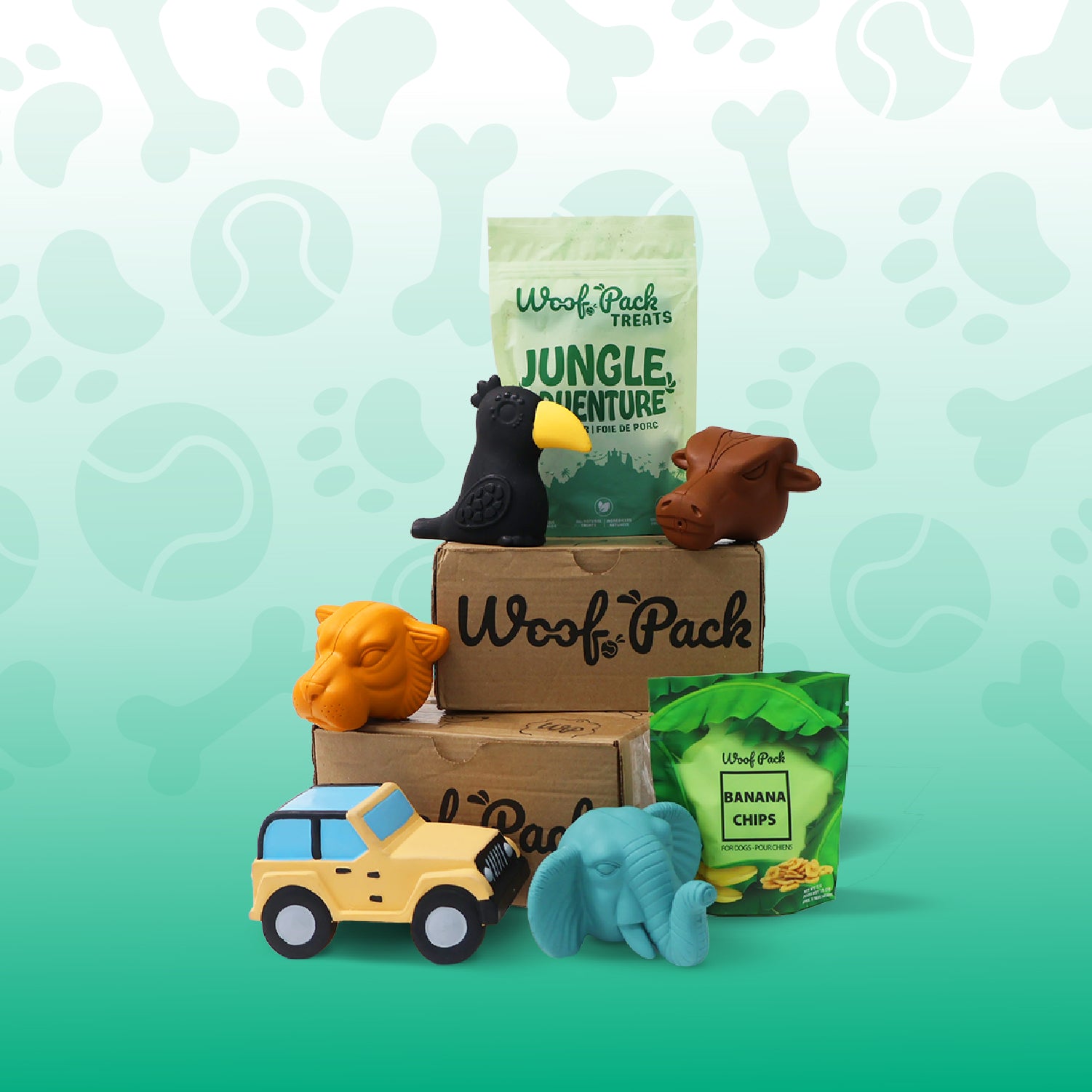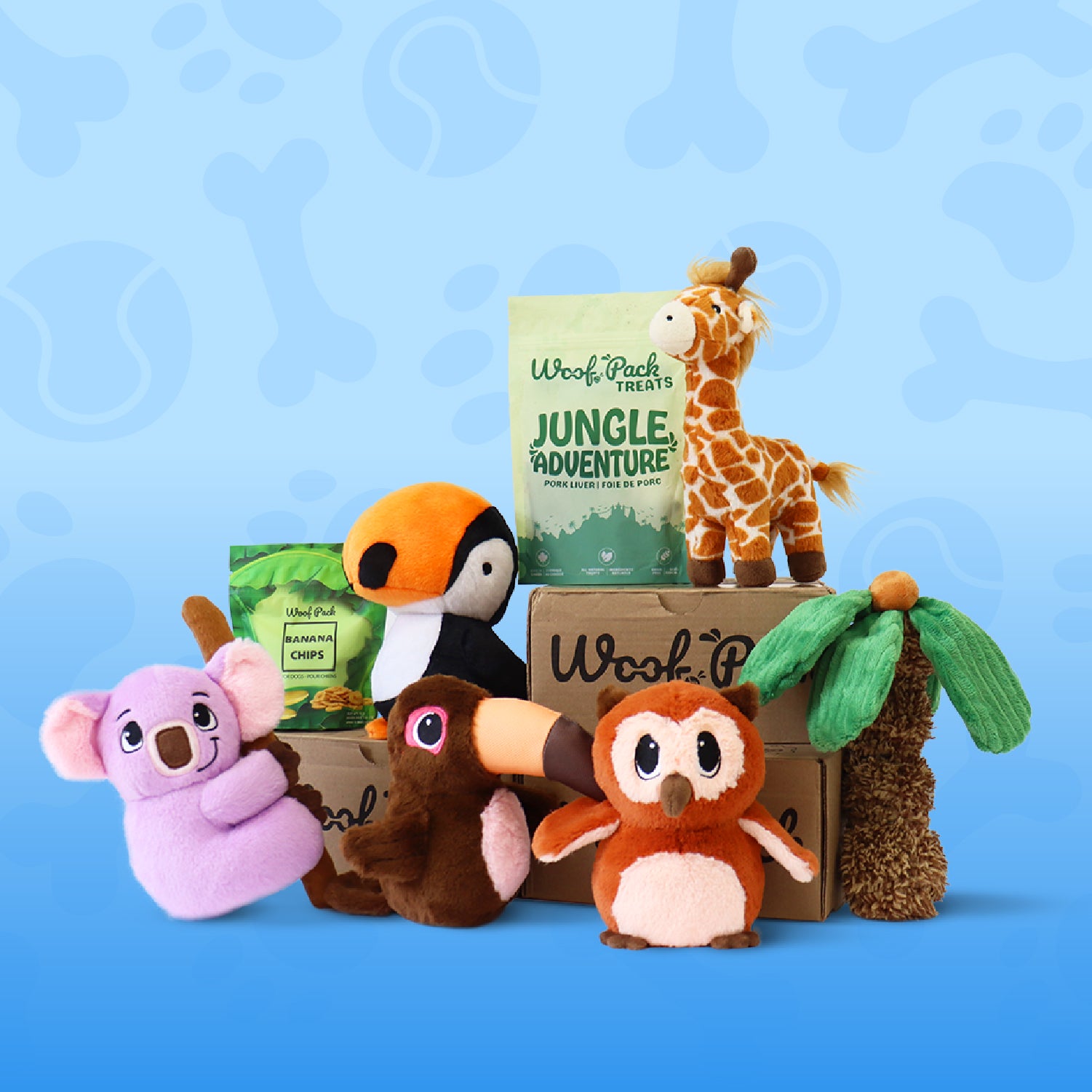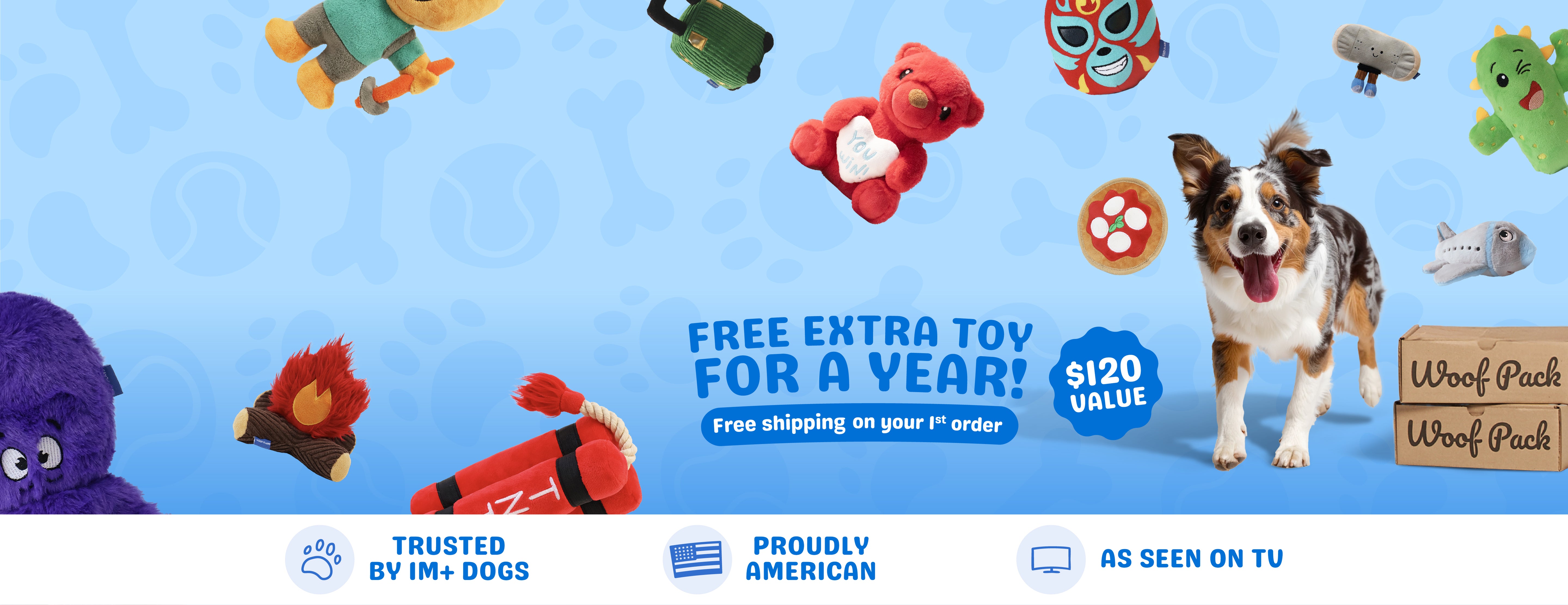 Each Woof Pack includes 4–5 premium items: 2 unique engaging, dog-tested toys and 2 bags of all-natural treats, valued at over $55. Every box is carefully curated with fun themes to keep your pup happy, healthy, and entertained each month.