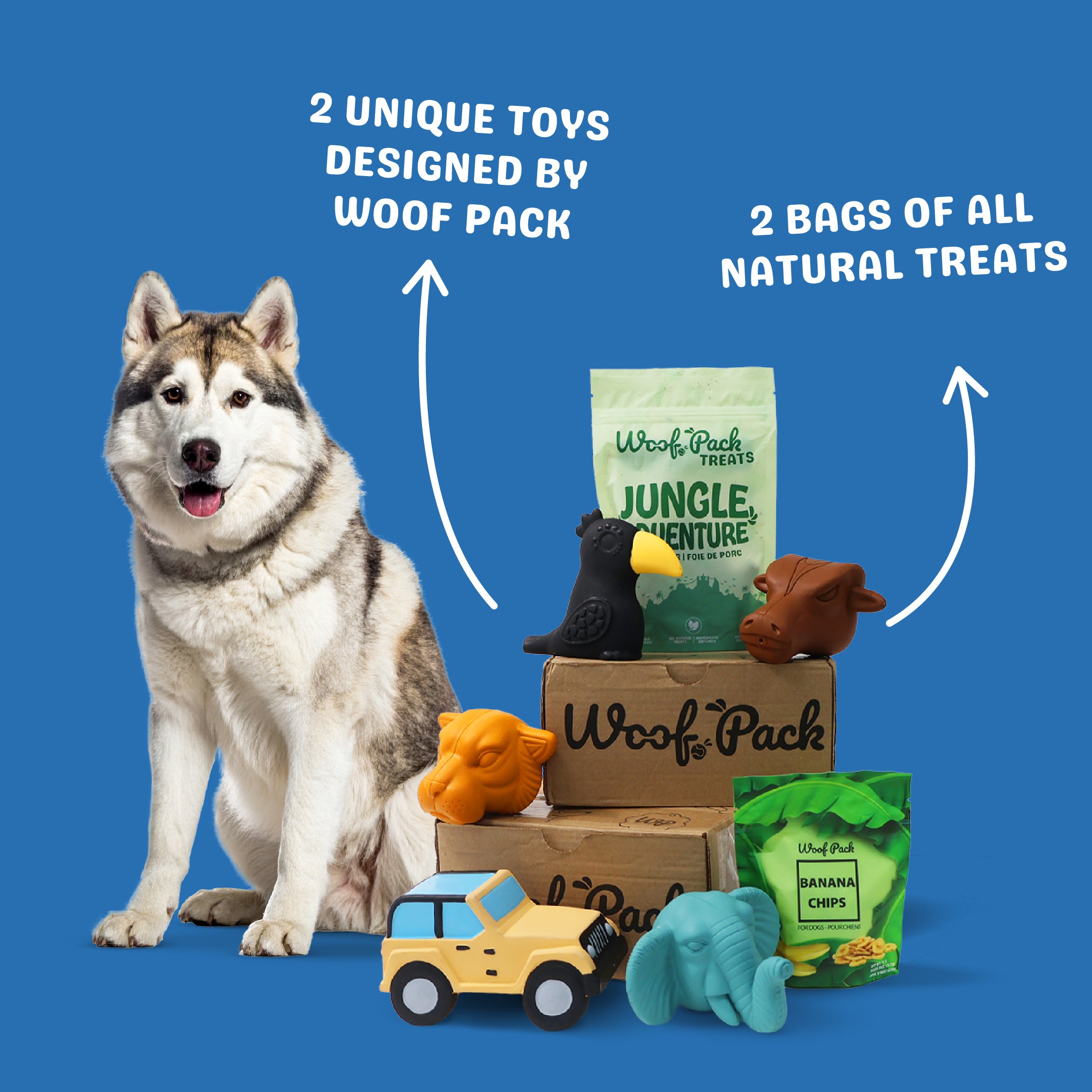 Each pack contains 4-5 items: 2 durable toys and 2 bags of treats. All valued at 55$ and more!
